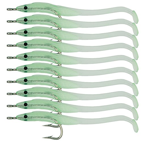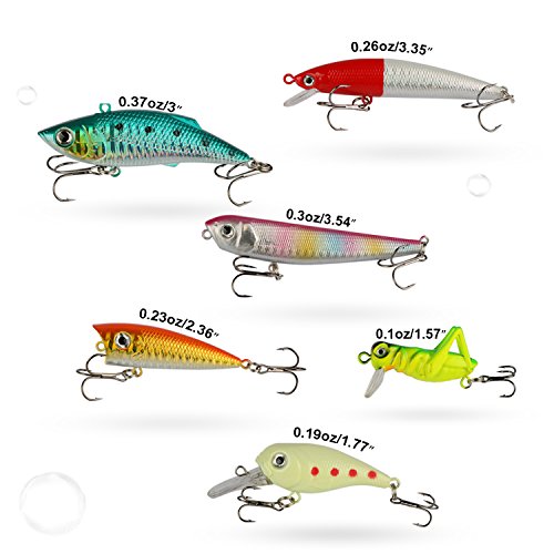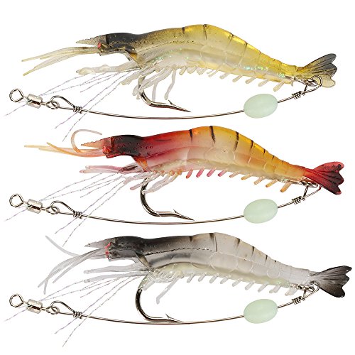 -. Feature : A complete soft fishing lures set with a handsome quantity that contains a pack of graceful gray fish lure (pack of 5), a pack of red tail fish lure (pack of 5), a pack of snig lure (pack of 10), a pack of lead head jigs (pack of 5), a pack of three-color shrimp (pack of 3), a pack of spinner frog (pack of 4), and a pack of shrimp lure rig (a rig with 5 lures). The total weight of the package is 312g/11oz / Soft silicone material for a very pliable hand feel, and lures with lead can be cast longer and dive into aim water depth accurately / Fine workmanship and high simulation shape make the lure look and taste like the real thing that provide a huge attraction for the targets / Various vivid colors include luminous which is fit for night fishing to satisfy different fishing scene / Different sizes of hooks with non-resistance barbs that won't affect the speed of piercing make the fish fall off the hook hardly possible