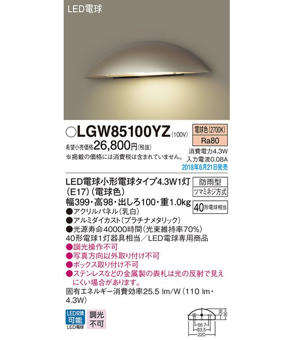 ●光源:LED電球小形電球タイプ4.3W1灯(E17)(電球色)、色温度:2700K、光源寿命40000時間(光束維持率70%)