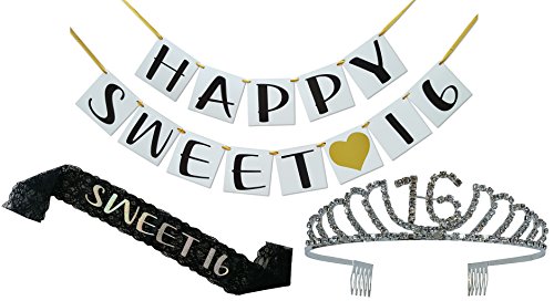 Birthday Party Supplies and Decorations - Sash, Tiara, and Banner All-in-One Pack (16th Birthday)