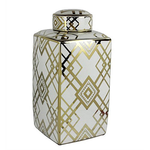 Benzara Captivating Square Decorative Ceramic Jar, White and Gold