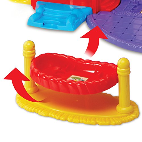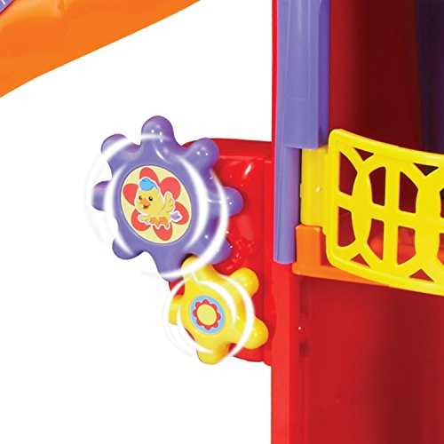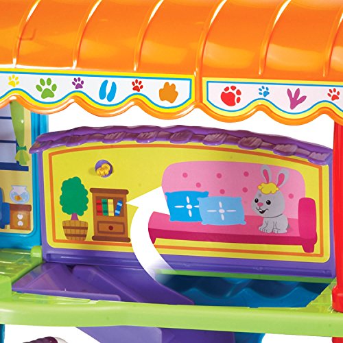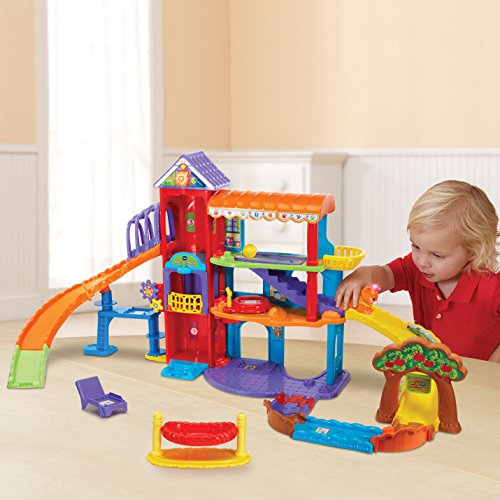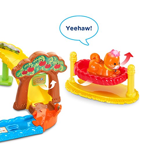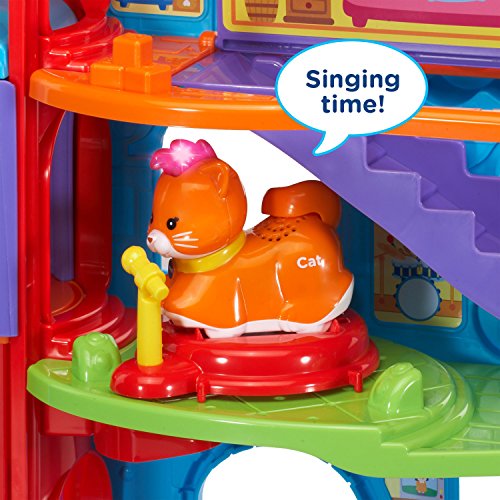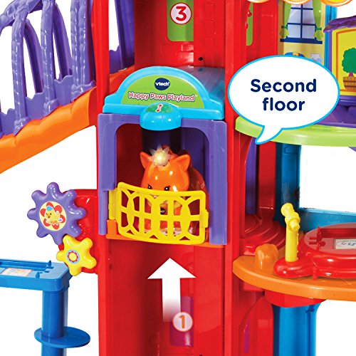Play and explore the Go! Go! Smart Animals Happy Paws Playland by VTech. This exciting playland for pets has three light-up buttons at the top of the elevator that introduce time concepts, colors and play sing-along songs, melodies and fun phrases. Put the adorable SmartPoint cat in the elevator and move it up and down to trigger playful responses on each floor. Then, hop on the slide to travel back to the first floor. Place the carefree cat on the eight SmartPoint locations, and she'll respond with songs, melodies, sounds and phrases. The playland also includes a turning telescope, swinging hammock, a secret trap door and more that help build fine motor skills. Chloe the carefree cat teaches the letter C, the color orange and the name of the animal through pretend play. Features 7 sing-along songs and 26 melodies. Requires 2 AA and 2 AAA batteries (batteries included for demo purposes only; new batteries recommended for regular use). Intended for ages 1 to 5 years.Feature