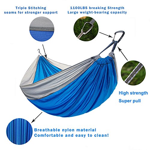 COMFORTABLY SUPPORTING UP TO 1000 lbs: This double hammock fits two persons, You can lay down with your friend or loved one and you will still have plenty of room. Because of the new 210T nylon parachute fabric, the camping hammocks provide relaxing support up to 1100 lbs