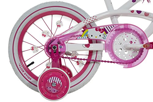 Your little Hello Kitty enthusiast will love the sweet handlebar case and Coordinating streamers on the dynacraft Hello Kitty girls' 16 inch bike. The quick-release seat and training wheels can be adjusted to fit your little one's needs. A durable steel frame helps ensure long-lasting use, and caliper brakes help your child stay in control while riding. Ages 4 to 8 years.Feature
