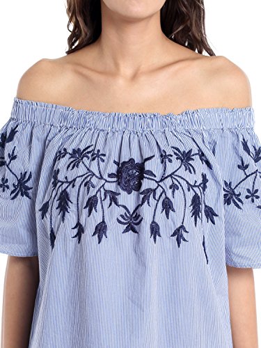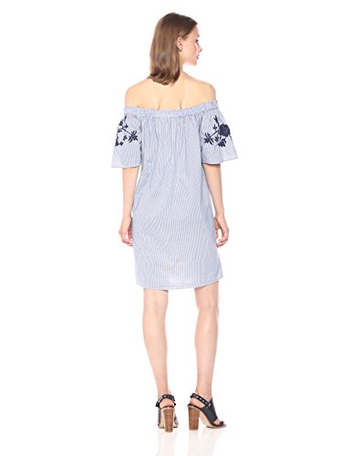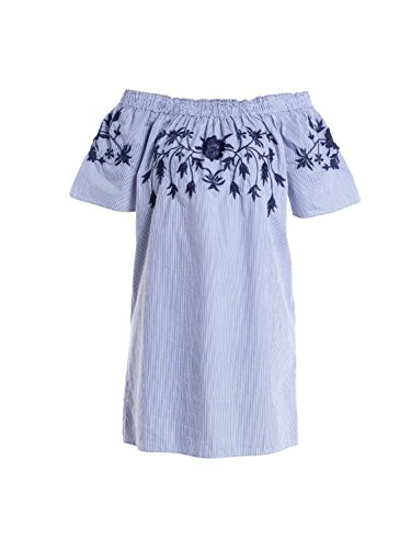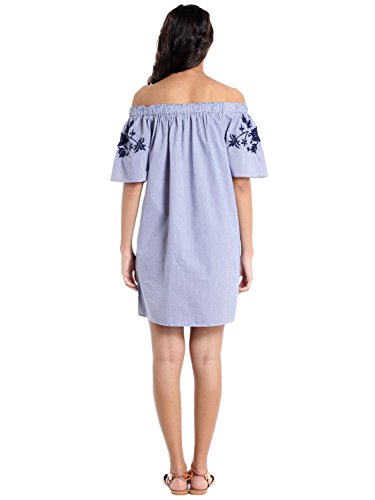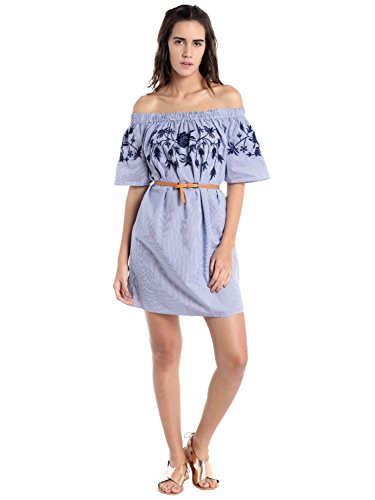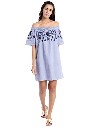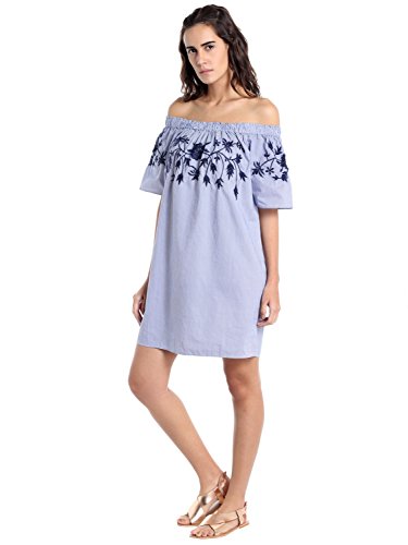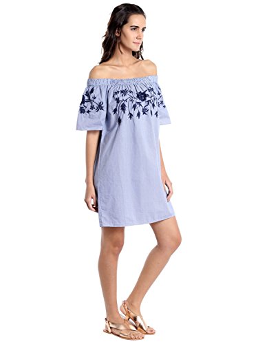 Woven off shoulder dress with floral embroidery detail at the top.