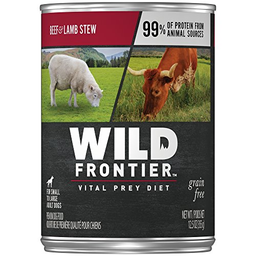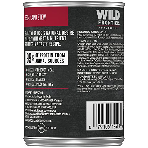 Contains (12) 12.5 oz. cans of Wild Frontier Vital Prey Beef & Lamb Stew-protein rich dog food to feed dogs' ancestral instincts