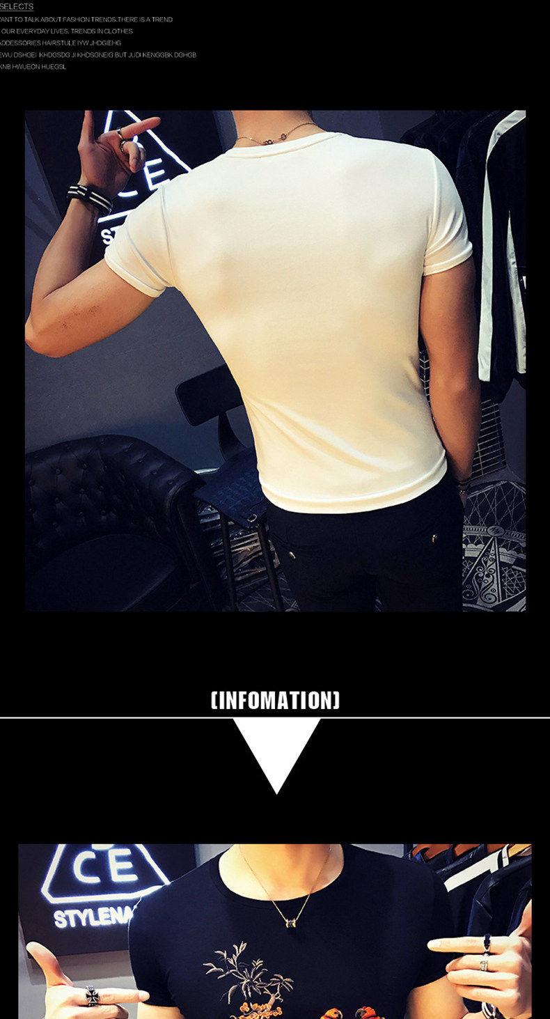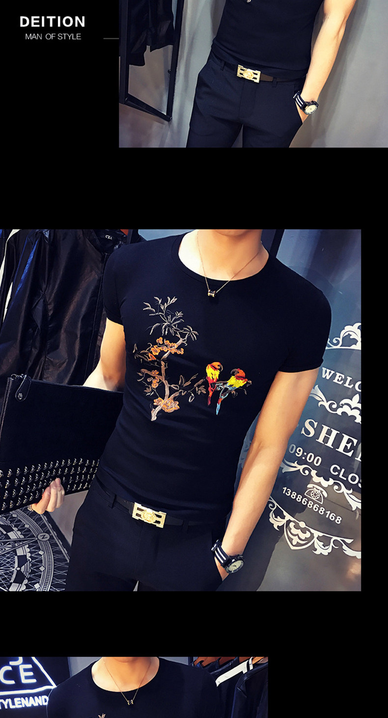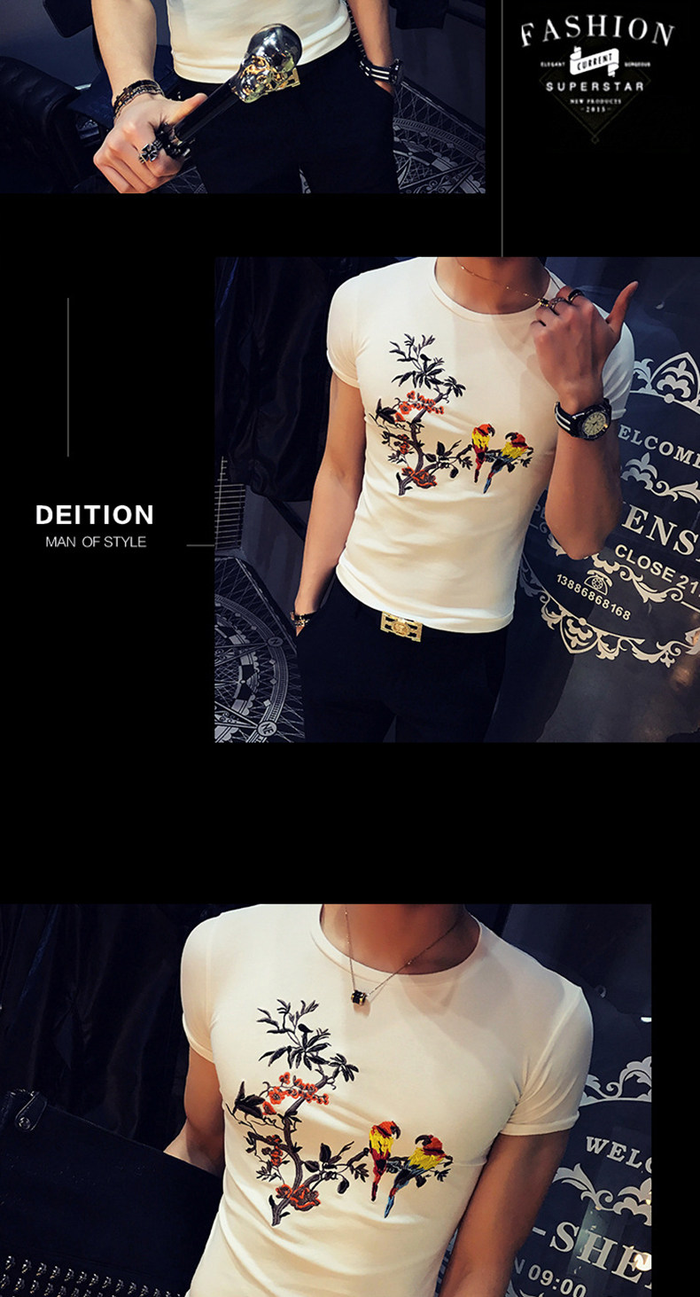 夏装韩版短袖男士t恤中国风绣花白色百搭潮流修身半袖体恤上衣服