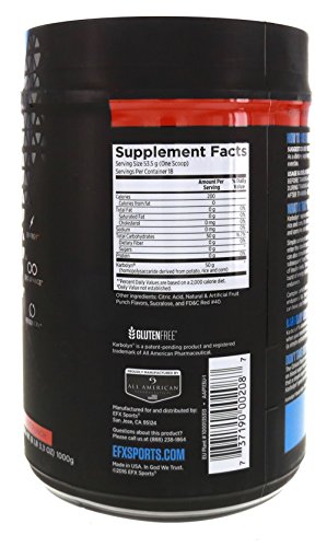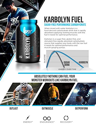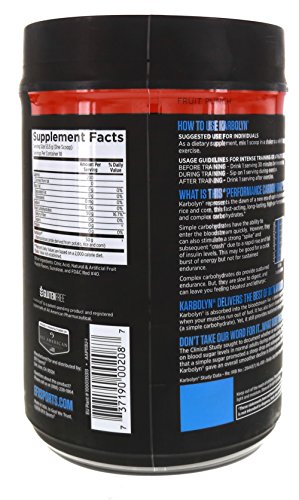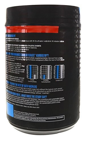 Studio : All American EFX Publisher : All American EFX Binding : Health and Beauty Product Description Karbolyn is the Outlast, Outmuscle, Outperform carbohydrate. It took over seven years to develop this ground-breaking technology, and after just one use you'll see why. Karbolyn offers the best of both "simple and complex carbohydrates": It absorbs fasts like a simple sugar, yet supplies your muscles with the sustained energy of complex carbohydrates. Now you can 'carb-load' in minutes and without stomach bloating. If you want a pure, clean carbohydrate source that's quickly converted into muscle glycogen (your body's powerhouse performance fuel) lightening-fast, this is it. Karbolyn is 100% gluten-free/stimulant-free and can be used pre-workout, during training or an event, or consumed after exercise to accelerate recovery. 0