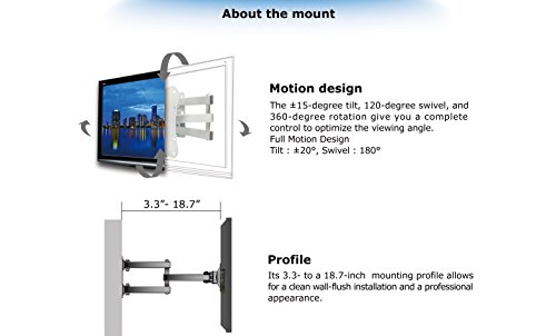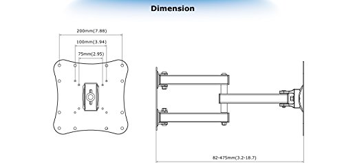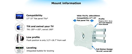 -. Feature : Fits most 15", 17", 19", 20", 22", 23", 24", 27", 29", 30", 32", 34" and some up to 37" TV and monitors / Load capacity up to 81 lbs; Compatible with VESA 75x75mm/100x100mm/200x200mm / The mount plate can be taken off easily to attach the display; Two piece "slide-in" installation for easy mounting; Integrated bubble level for easy leveling / Extend out up to 18.7"" from wall, and 3.3" inch profile when folds flat, Tilt +/-20º and Swivel 180º / Tilt forward up to 20 degrees;3 pivot points for virtually limitless adjustment