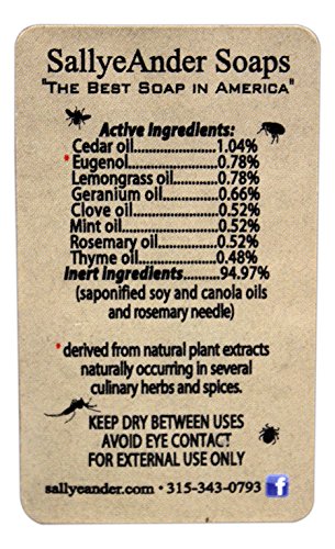 SallyeAnder's "No-Bite-Me" soap bar is derived from all natural essential oils, including cedar, lemongrass, geranium, mint, thyme, clove, and rosemary. The 100% handmade hypoallergenic bar is free of parabens, alcohol, and DEET, and is effective on black flies, mosquitoes, fleas, and ticks. The set includes two 5 ounce soap bars.Feature