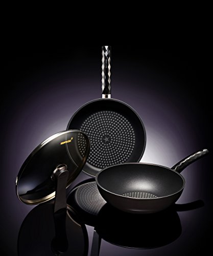 -. Feature : 2500 Ton Forged Aluminum Construction / Quarter inches thick yet light weight Aluminum Construction / 5 Layers of Diamond coating, Best known NON-STICK cooking surface / Protective Porcelain Anti-Scratch, Anti-Stain Outer Coating / Tempered Glass Lid with automatic steam vent and self standing function.