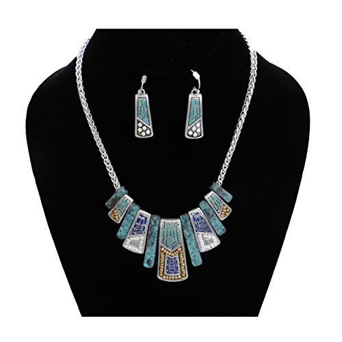 -. Binding : Jewelry -. Brand : Icon Collection -. Department : Womens -. EAN : 0710465874022 -. Feature : Mosaic Design Tribal Native American Style With Burnished Silver & Turquoise Bib / Burnished Silver with Turquoise Metal and white and gold seed beads / 18 inch long chain with a 2 inch extension / Matching pierced earrings. / Great necklace for a casual yet classy look with an ethnic flair. -. ProductGroup : Jewelry -. ProductTypeName : FASHIONOTHER -. Title : Mosaic Design Tribal Native American Style Southwest Silver & Turquoise Bib Necklace -. UPC : 710465874022