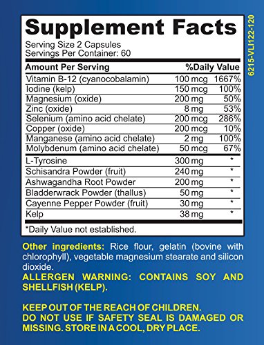 Professionally formulated with Iodine, Vitamin B-12, Magnesium, Zinc, Selenium, Copper, Manganese, Molybdenum, L-Tyrosine, Schizandra, Ashwagandha Root, Bladderwrack, Cayenne Pepper and Kelp
