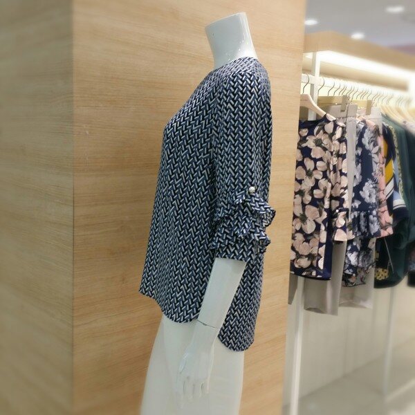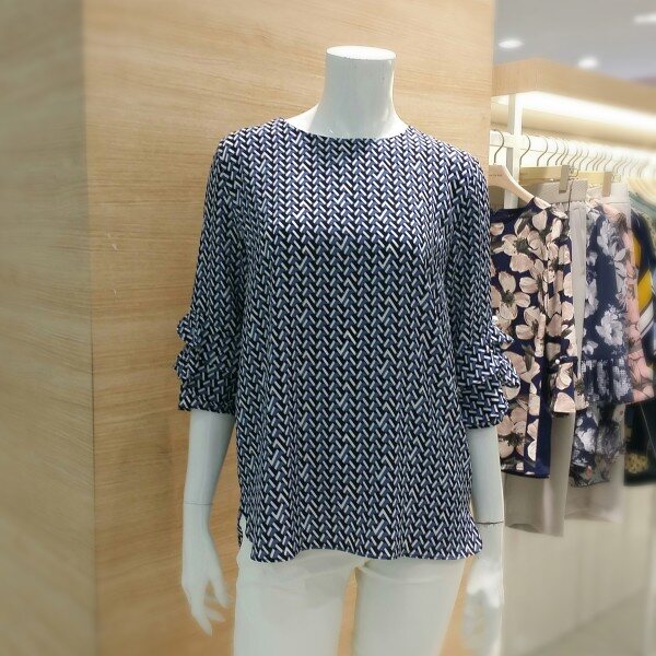 기하학 프린트바탕에 소매프릴 포인트를 준 블라우스입니다적당한 기장과 스판소재 사용으로착용감이 편안해요