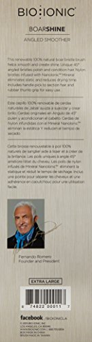 This renewable 100% natural boar bristle brush helps smooth hair. The unique 45 degree angled bristles allow the hair to lie on top of the bristles for ultimate shine. Nylon bristles infused with nanoionics mineral eliminates static and reduces drying time.Feature