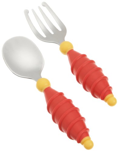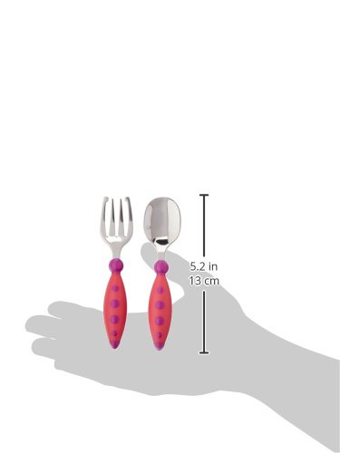 -. Feature : Safely introduces toddler to utensils / Wide, easy-grip handles for little hands / Rounded fork tines for extra safety / Includes(1) fork, (1) spoon / Dishwasher-safe and BPA-free