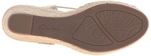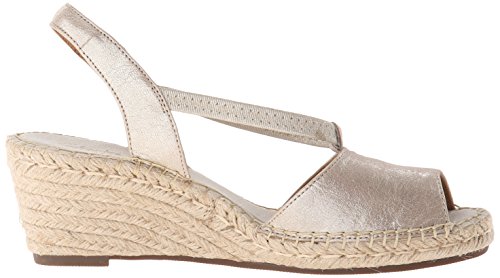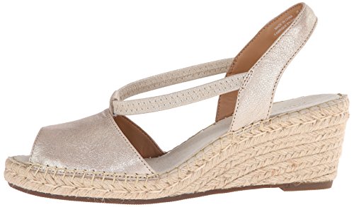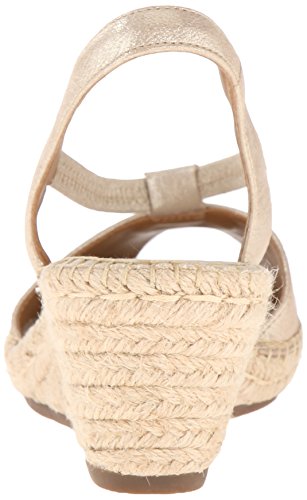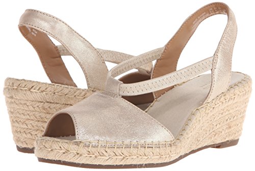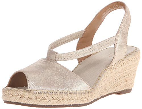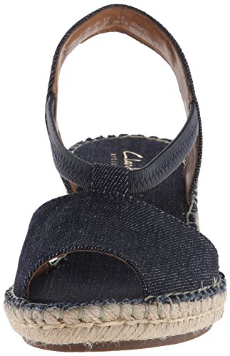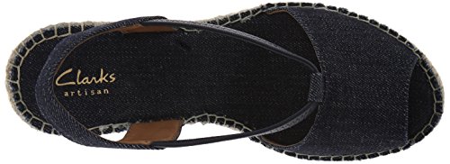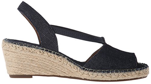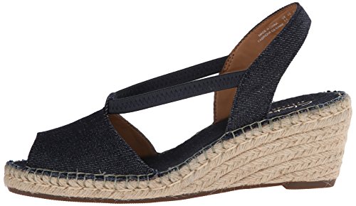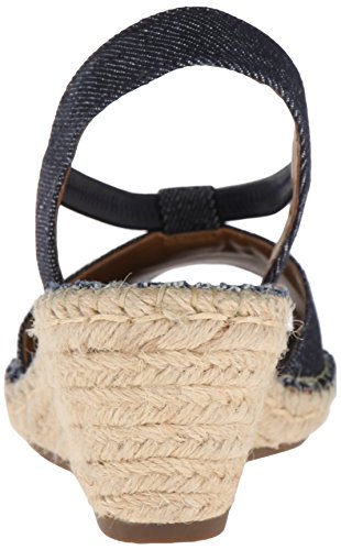 Peep-toe espadrille wedge featuring denim upper with elasticized midfoot strap