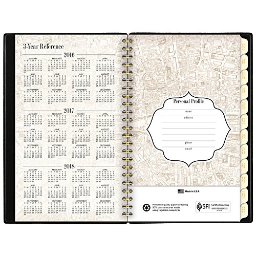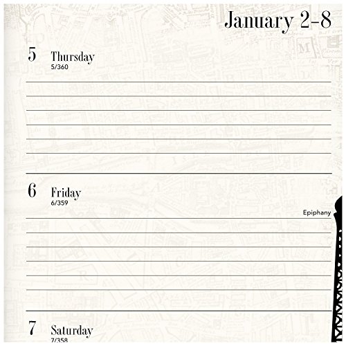 -. Feature : Neatly organize weekly and monthly plans and imagine that you are exploring the city of Paris with this fashion planner. Planner includes 12 months of planning pages from January - December and includes Julian dates. / One week per two page spread features equal sized planning space for each day of the week, Mon-Sun, and notes space at the start of the week. One month per two page spread features unruled daily blocks, notes space and past/future month reference. / Monthly tabs make it easy to open the weekly/monthly planner to any date. Beige color pages feature the streets of Paris as a faint backdrop to your plans. Image of the Eiffel tower is P.R.Inted on the right hand page of each weekly spread.