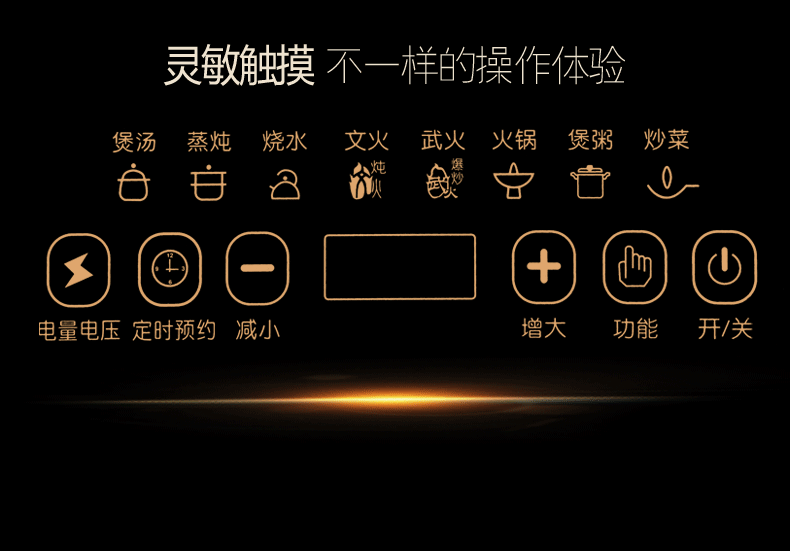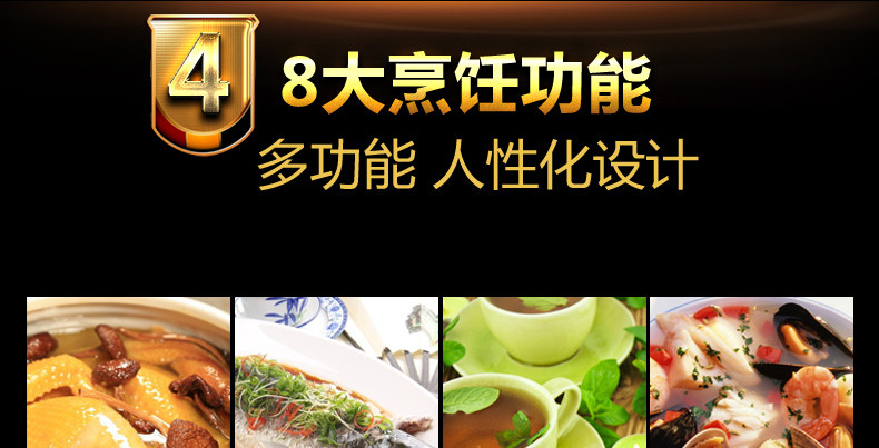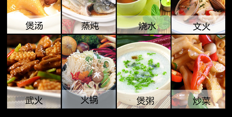 功能: 爆炒 炒菜 炖奶 蒸煮 煮粥 煲汤 火锅 烧水 煎炸 定时 文火煲 武火