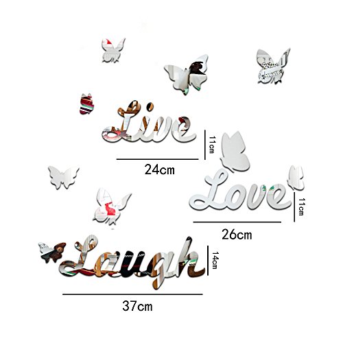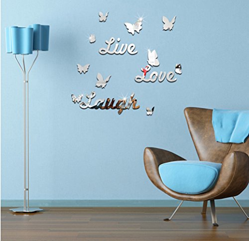 DIY Wall Stickers Live Love Laugh Butterfly Mirror Effect Décor for Home Room Wall (Sliver)