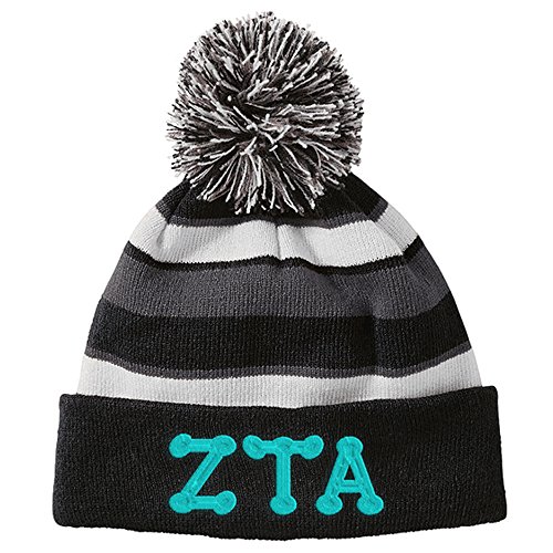 Product DescriptionZeta Tau Alpha Lettered Comeback Beanie Warm and soft 100% acrylic rib knit Tri-color pom-pom detail on top Folded hem Fit type: One size - Great cute Greek font.0