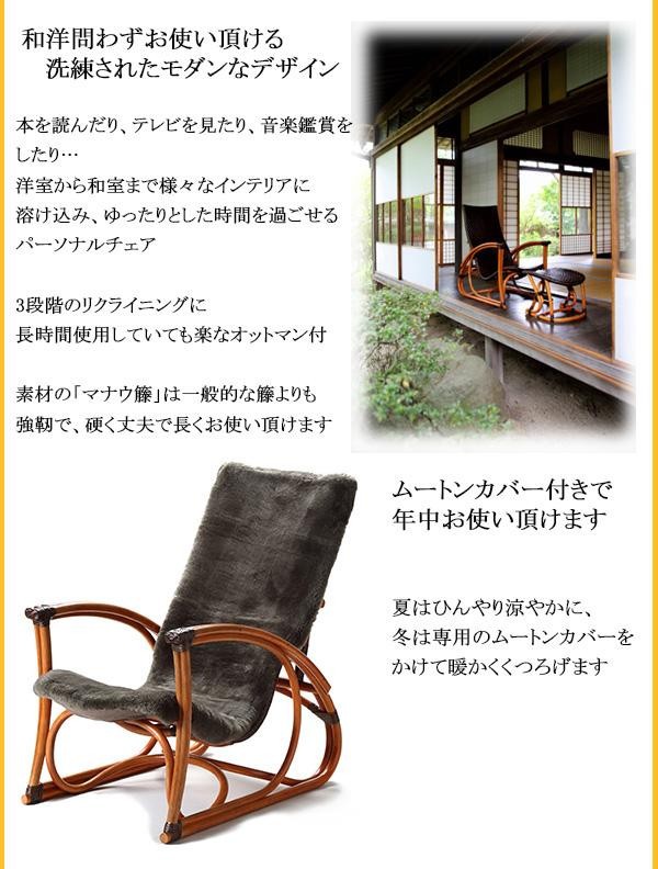 | 素材・材質 | 本体・オットマン:マナウ籐(編部/セガ籐) 専用カバー:羊毛皮100%(ショーンラムスキン) |