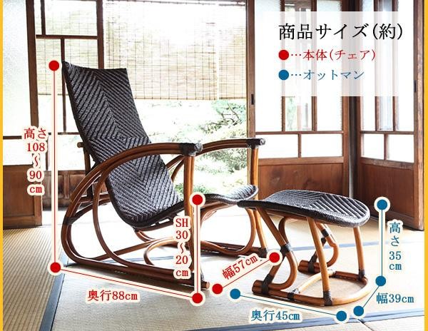 本を読んだり、テレビを見たり、音楽鑑賞にも最適!!あなた専用の、あなたの為だけのパーソナルチェア。籐ならではのしなやかさと座り心地の良さが最大の魅力です。オットマン付で長時間使用も楽です。背もたれは三段階調整可能。 |