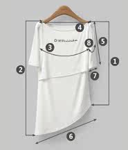| 尺码 | ①左前衣长 | ②右前衣长 | ③胸围 | ④肩宽 | ⑤袖长 | ⑥下摆围 | ⑦袖口围 | ⑧上臂围 | ||
