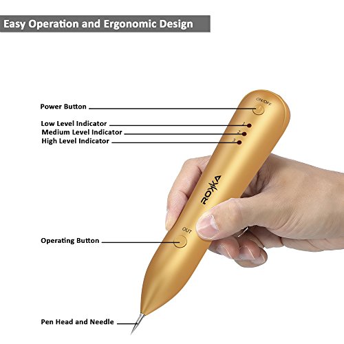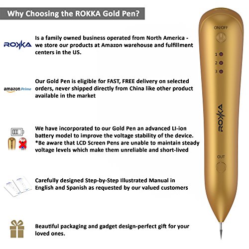 - ROKKA GOLD PEN: 2018 upgraded with a Step-by-Step bilingual Instruction Manual. With the new advanced Li-ion battery we have improved the voltage stability of our model. This Beauty Removal Sweep Spot Pen is considerably safer and more efficient to use than other models available.