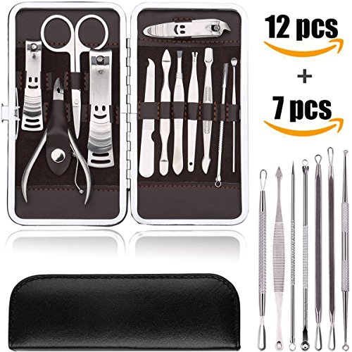 KINGMAS 19-PIECE STAINLESS STEEL MANICURE PEDICURE SET NAIL CLIPPERS AND BLACKHEAD REMOVER PIMPLE ACNE REMOVAL TOOL GROOMING KIT WITH LEATHER TRAVEL CASE (12+7)