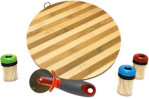 BUNDLE INGREDIENTS: (1) 13" Round Bamboo Cutting Board (1) Pizza Wheel Cutter Knife (colors vary) (3) Multi Color ToothPick Holders w Toothpicks