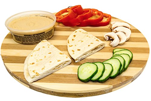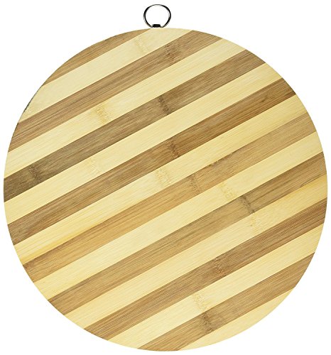 ROUND CUTTING BOARD: This heavy duty cutting board is made of layered bamboo and measures 13" in diameter. This chopping palette is ideal for pizza, vegetable, cheese & cracker display and more. Perfect for parties or serving appetizers by the pool. Comes with a metal ring installed at top for easy storage.