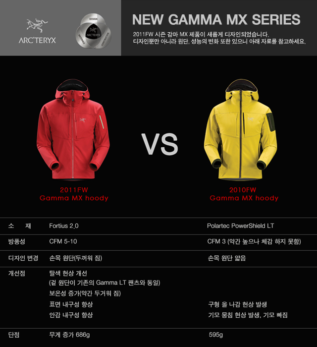 "아크테릭스의 남성용 감마 MX 바지는 상을 받은 고전적인 소프트쉘 바지다. 눈과 비를 막아주고, 가벼우며, 신축성이 있는 폴라텍 파워쉴드 원단이 사용되어 방벽 등반, 스키 투어 및 고산 등반 시 동작이 자유롭다. 일체형 킥 패치(kick patch)가 있어 스키의 날이나 크램폰으로부터 바지를 보호하며 안쪽에는 부드럽게 기모 처리가 되어 있어 따스하다."