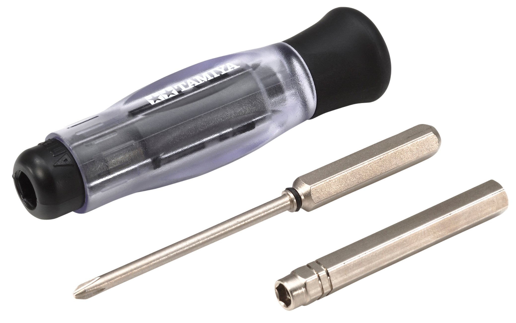 It consists of a screwdriver bit for 2 mm screw, 2 mm nut, 2 mm lock nut, 4 mm pillow ball box driver bit, rotating grip.