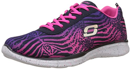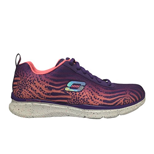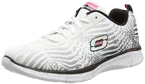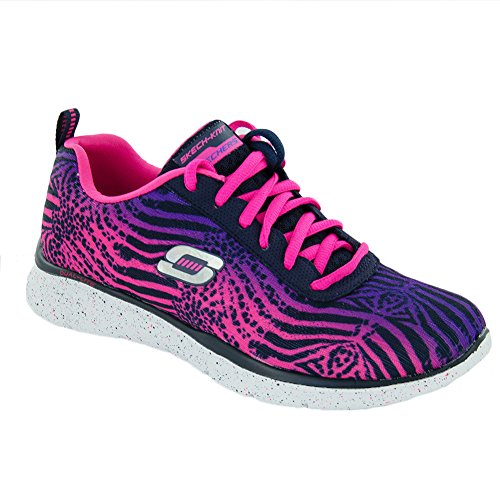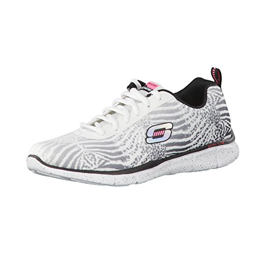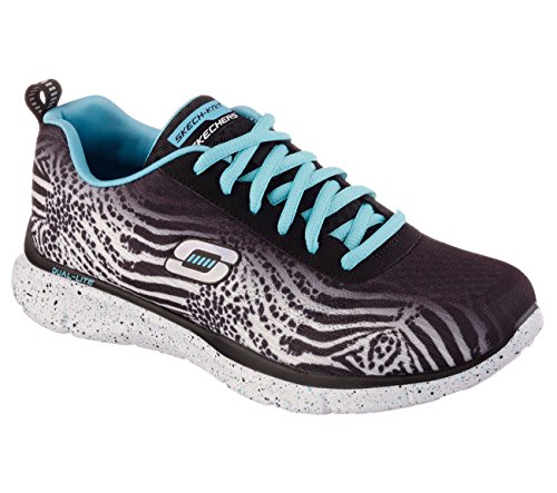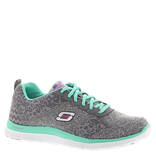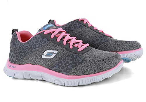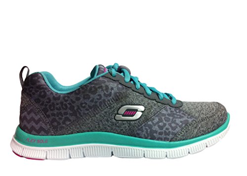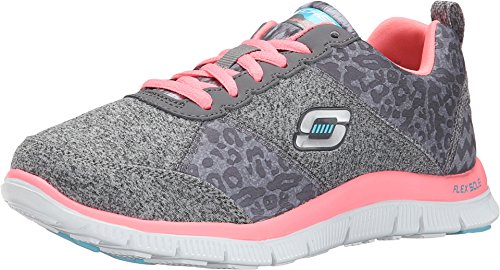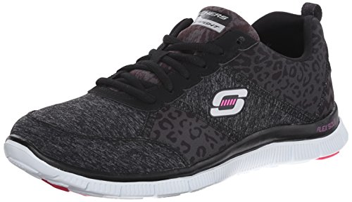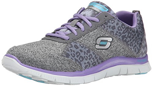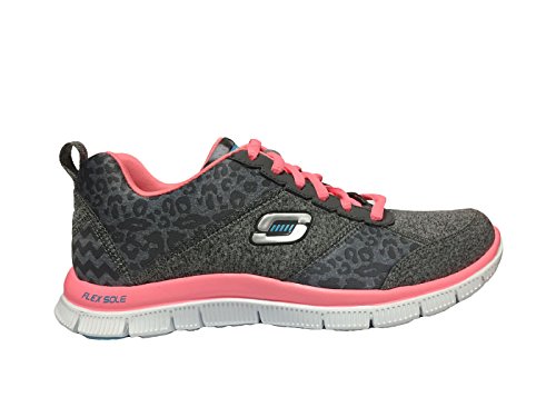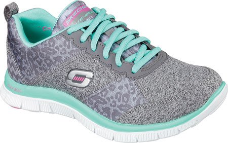 Rule the urban wilderness with the SKECHERS Flex Appeal Tribeca shoe. Soft heathered finish jersey knit fabric upper Leopard print design on side and heel panels Lace up athletic sporty cross training sneaker design Stitching accents Flatlock stitching detail on front and side panels Side S logo Striped design on lower heel panel Lace up front with synthetic durable lace area Contrast colored collar trim Padded collar and tongue Soft fabric shoe lining Memory Foam cushioned comfort insole Shock absorbing lightweight FlexSole midsole design Contrast colored topsole trim Flexible lightweight traction outsole 1 inch built in heelFeature