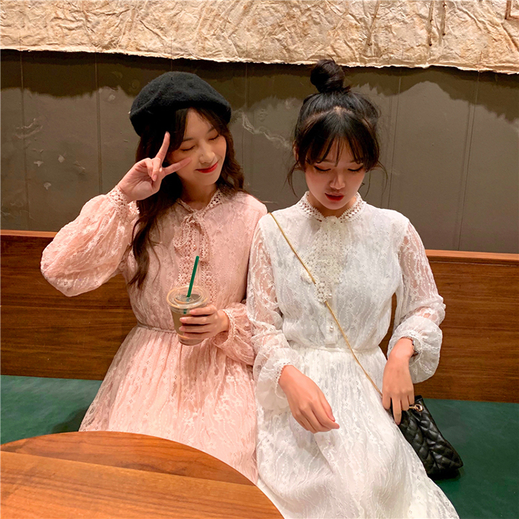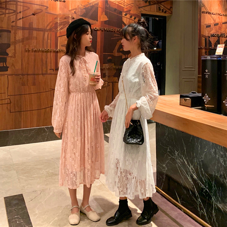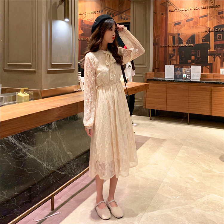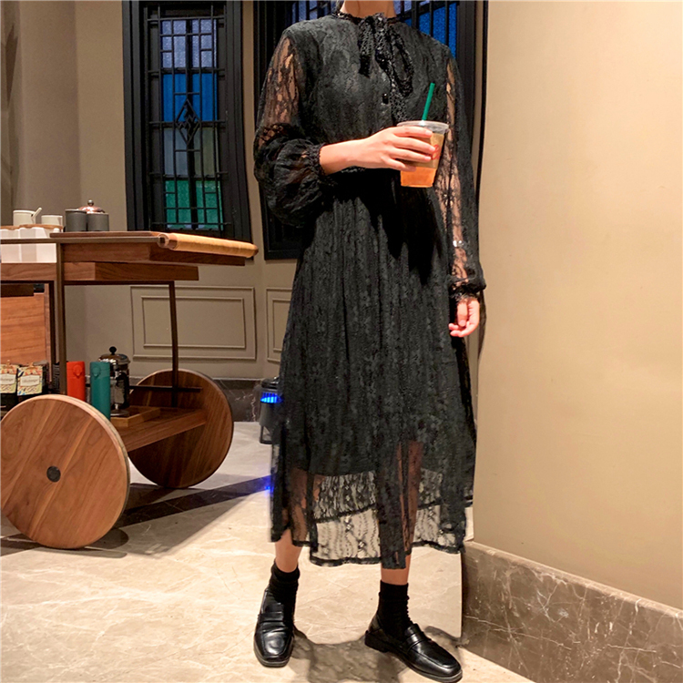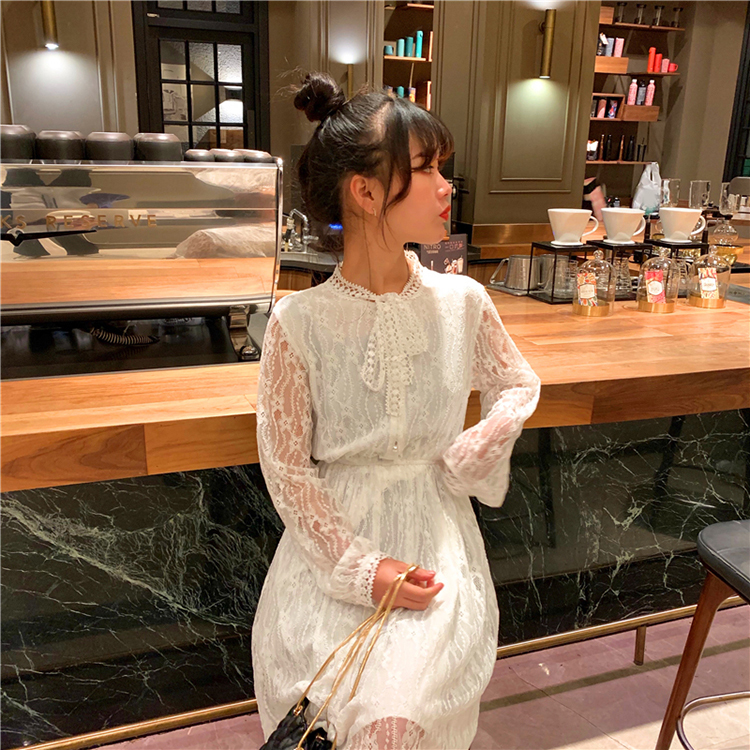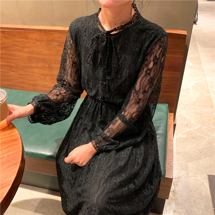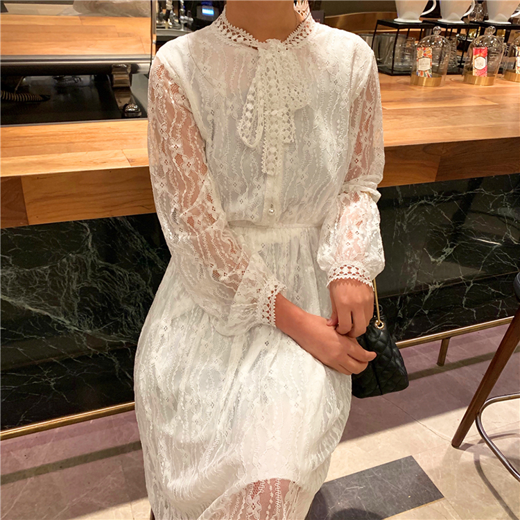 ボウタイが大人可愛い、1枚でキマるロング丈の総レースワンピースです。
