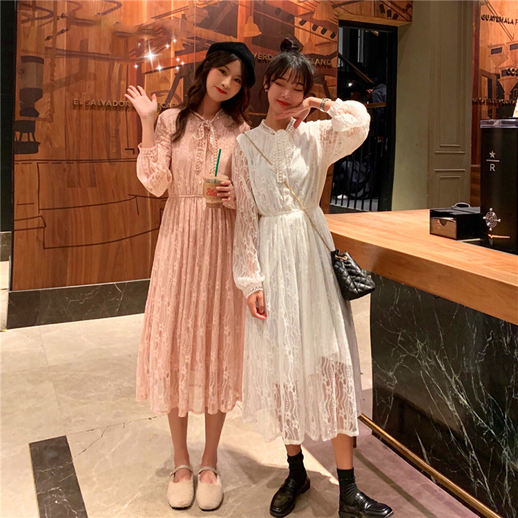 パーティードレス 結婚式 ボウタイ 総レース レトロ ワンピース ロング Aライン 大人可愛い