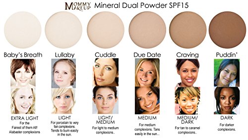 Powder, Foundation and protection in one compact! This PRESSED mineral powder is oil-free, talc-free and fragrance-free making it ideal for sensitive skin. SPF15 protects your face from the sun and environment. It diffuses light with natural reflecting properties found in minerals to create a soft focus finish. Adjustable formula makes it a foundation and powder in one! For best results, swirl a Kabuki brush in powder and dust all over face, including eye area. Available in Six Shades: BABY'S BREATH (EXTRA LIGHT) - For the Fairest of them All! Alabaster complexions. LULLABY (Light) - For porcelain to very fair complexions. Tends to burn easily.CUDDLE (Light/Medium) - For light to medium complexions.DUE DATE (Medium) - For medium complexions. Tans easily in the sun.CRAVING (Medium/Dark) - For tan to caramel complexions.PUDDIN' (Dark) - For darker complexions.Feature