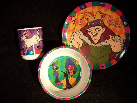 -. Feature : Bright Colored 3 piece Dinnerware Set / Non-Toxic / Dishwasher Safe / Quasimodo - Djali the dancing Goat - Clopin the Jester / Child Sized Plate - Bowl & Tumbler