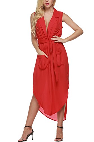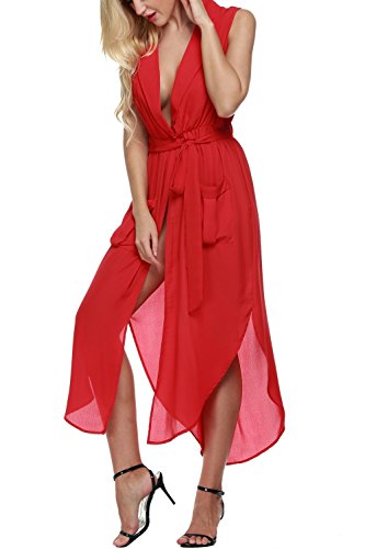 -. Feature : Material: Chiffon / Garment Care: Hand-wash and dry clean / 5 Colors: Red, Light blue, Dark blue, black, Army green / Design: Front and side slit,Pocket, Belt,High waist,Lapel v-neck / There are 5 size available, please refer to the size measurement below before ordering.