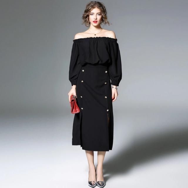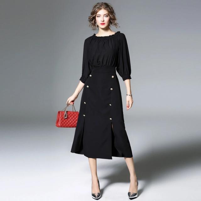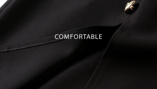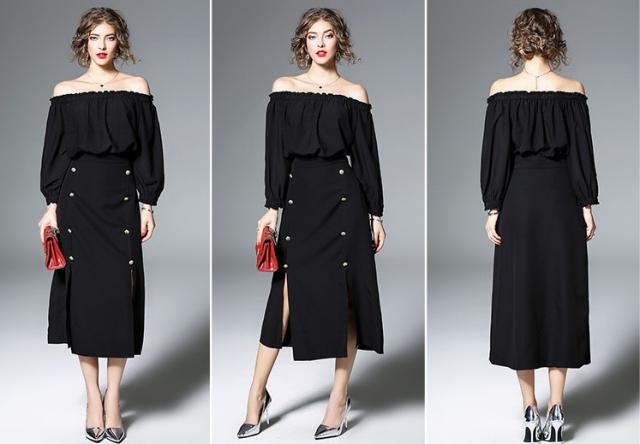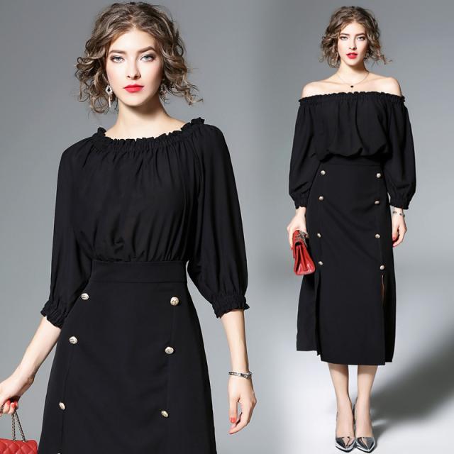 スカート部分は今季トレンドの前ボタンデザインと、大きめスリットで程よい肌見せを。