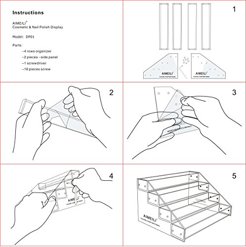 - Please note: AIMEILI logo is printed on both sides of the display. And please don’t forget to pull the protective film off of each shelf while assembling. If you are unhappy in any way, please don't hesitate to contact us