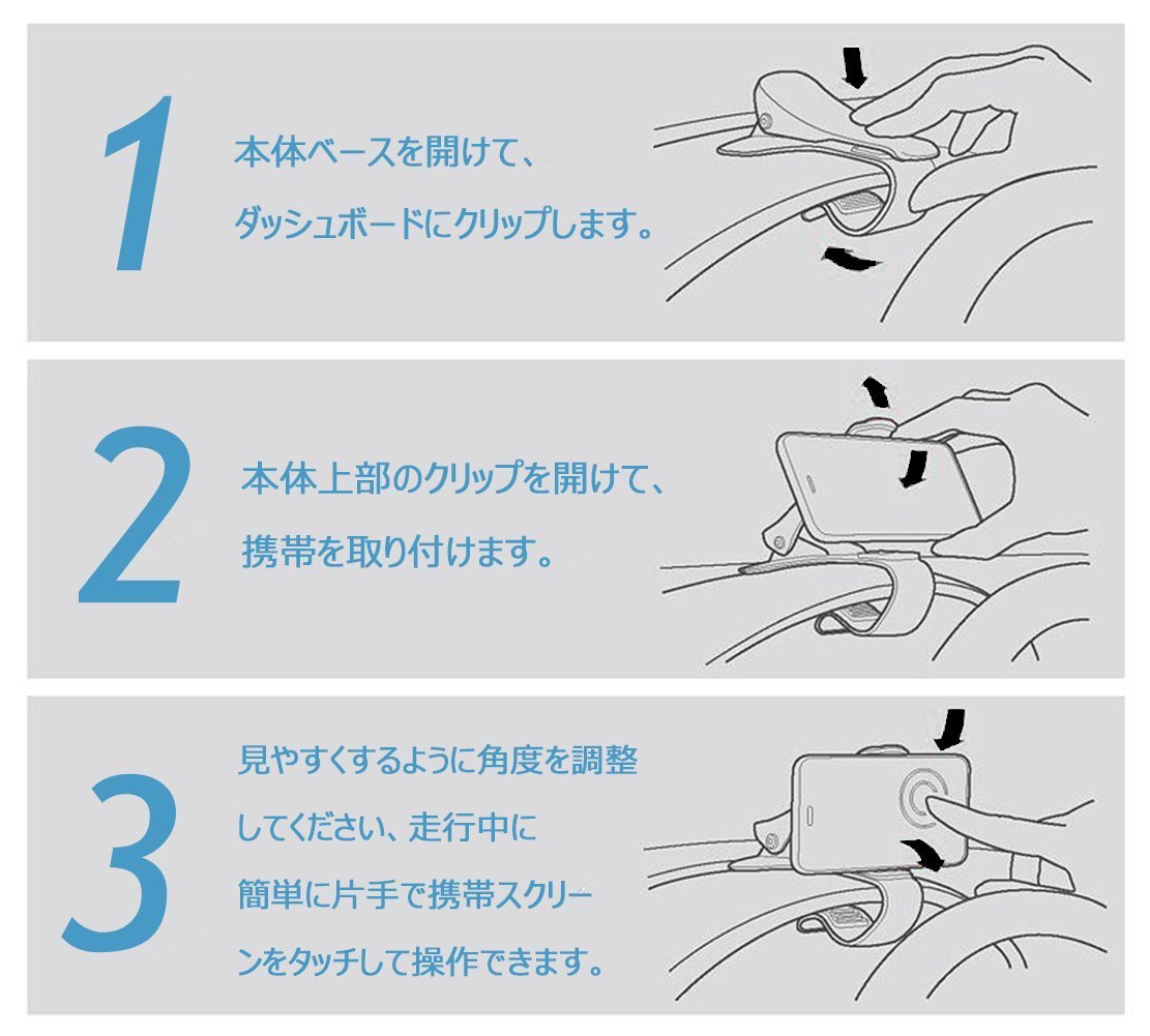 2, Open the clip on the top of the main unit, and attach the mobile phone.