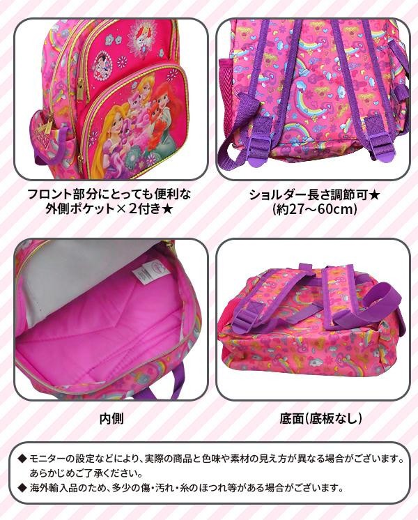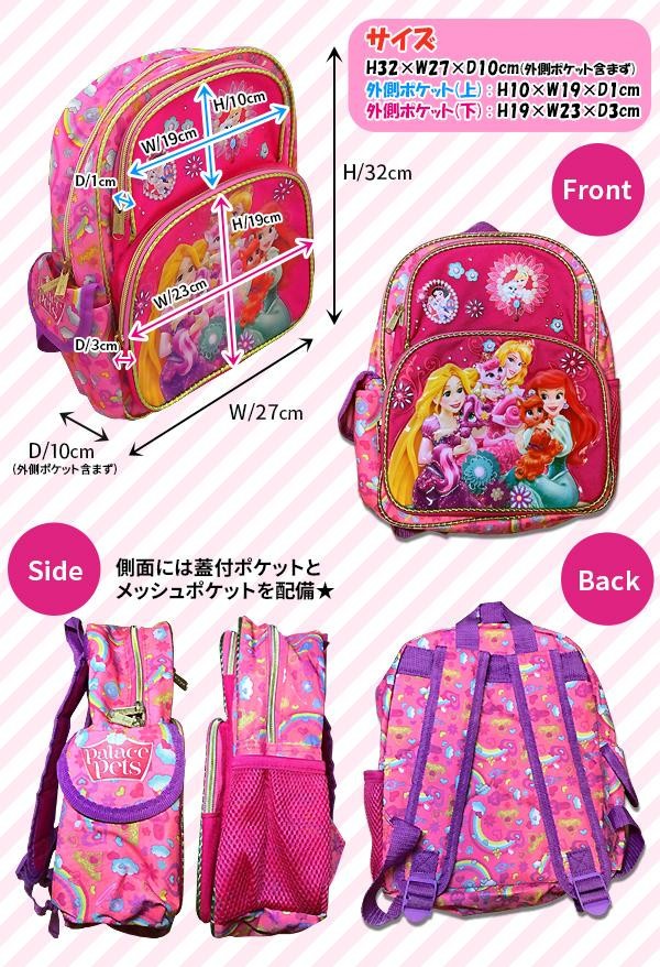 | プリンセスとペット達のデザインが可愛い、お子様向けのリュックです。両サイドにもポケットが付いており、ちょっとしたものを入れるのに便利。派手でかわいいデザインは海外輸入品ならでは♪ |