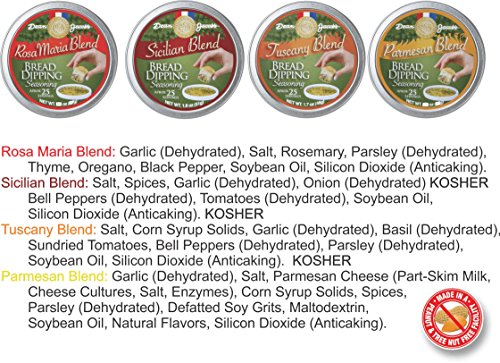 -. Binding : Misc. -. Brand : Dean Jacob's -. EAN : 0715483862310 -. Feature : Dean Jacob's Bread Dipping Collection ~ Set of 4 Tins / ► Sicilian ~ 1.8 oz ► Parmesan ~ 1.75 oz. Tin ► Tuscany ~1.70 oz.Tin ► Rosa Maria ~ 1.75 oz. / Pairs deliciously with Dean Jacob's Cold Pressed Extra Virgin Olive Oil. / Dean Jacob's bread dipping saucers sold separately. / Seasonings are packed in a sealed, cellophane pouch. These pouches are then placed inside the tin and the tins are shrink wrapped. -. IsAdultProduct : 0 -. Label : Xcell Int. -. Manufacturer : Xcell Int. -. PackageQuantity : 1 -. ProductGroup : Grocery -. ProductTypeName : GROCERY -. Publisher : Xcell Int. -. Studio : Xcell Int. -. Title : Dean Jacob's Bread Dipping Collection ~ Set of 4 Tins -. UPC : 715483862310