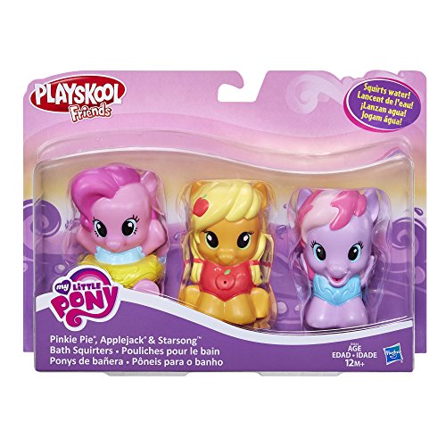 -. Binding : Toy -. Brand : Playskool -. EAN : 0630509383696 -. Feature : Add silly, splashy surP.R.Ises to your little one's bathtime / Set of 3 Bath Squirters features Pinkie Pie, Applejack, and Starsong / Fill the ponies with water and squeeze / Ages 12 months and up / Includes 3 Bath Squirters figures. -. Label : Hasbro -. Manufacturer : Hasbro -. Model : B4624AS0 -. MPN : B4624AS0 -. PackageQuantity : 1 -. PartNumber : B4624AS0 -. ProductGroup : Toy -. ProductTypeName : TOYS_AND_GAMES -. Publisher : Hasbro -. Studio : Hasbro -. Title : Playskool Friends My Little Pony Bath Squirters -. UPC : 630509383696 -. Warranty : No Warranty