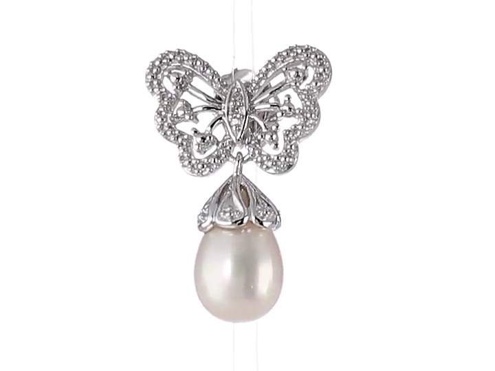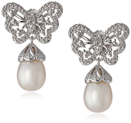 Sterling Silver Freshwater Cultured Pearl Diamond Butterfly Drop Earrings