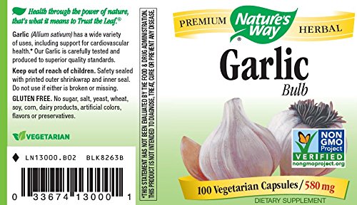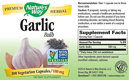 -. Binding : Health and Beauty -. Brand : Nature's Way -. Label : Nature's Way -. Manufacturer : Nature's Way -. ProductGroup : Health and Beauty -. ProductTypeName : HEALTH_PERSONAL_CARE -. Publisher : Nature's Way -. Studio : Nature's Way -. Title : Nature's Way Garlic Bulb, 580mg, 100 Capsule