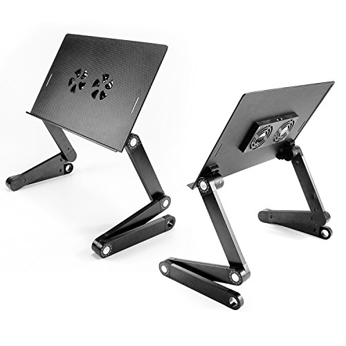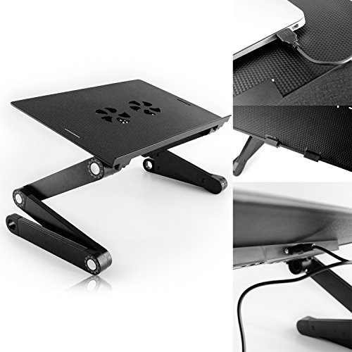 - Feature : LIGHT WEIGHT, HIGH STRENGTH ALUMINUM TRAY, STURDY LEGS - Makes Carrying Easy and Holds Your Computer Firm and Steady. / FULLY ADJUSTABLE LEGS - Rotate 360 Degrees and Lock in Place at Various Angles. Quickly Collapse The Stand to Make it Portable. / MULTIPLE USES - Table Can Also Be Used For a TV Dinner Tray, Sound Equipment, Projector, Standing Desk, Book Tray, Writing Desk, and Tablet Holder. / SILENT USB POWERED CPU COOLING FANS - Connect USB Cord (Included) to Your Computer to Power The Quiet Cooling Fans. / MONEY BACK GUARANTEE - If You Do Not Like It or Don't Want It For Any Reason, We Will Happily Accept The Return and Give You Your Money Back. No Questions Asked.