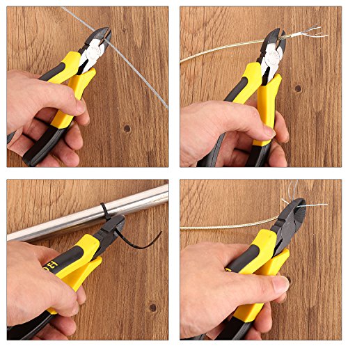 - Lineman’s Pliers : “7.9 inches length in total ” .Solid and strong cutting edge makes this tool more durable and a longer lifespan than others .It can be used for cutting some hard or soft wires and cables ,pulling up or pinching off the nails .