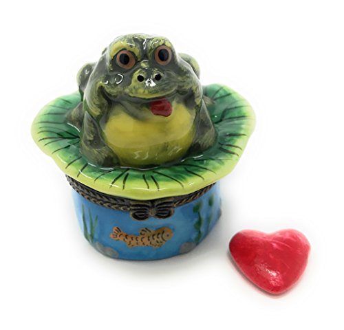 Porcelain Fat Toad on Lily Pad Hinged Lid Trinket Box with Tiny Trinket Inside, By Artgifts, 2.25H